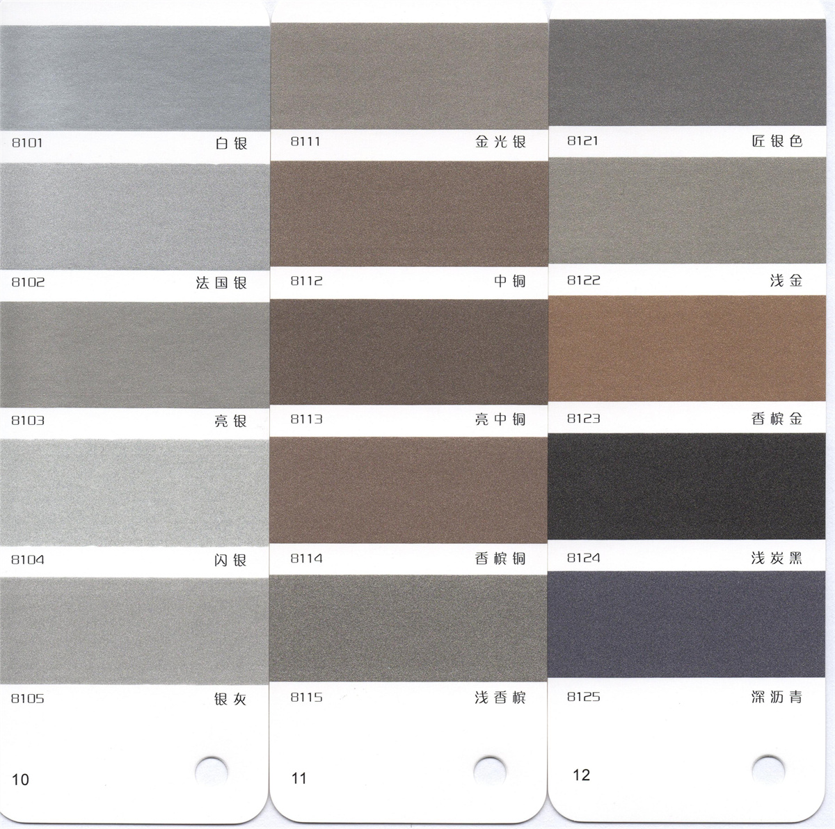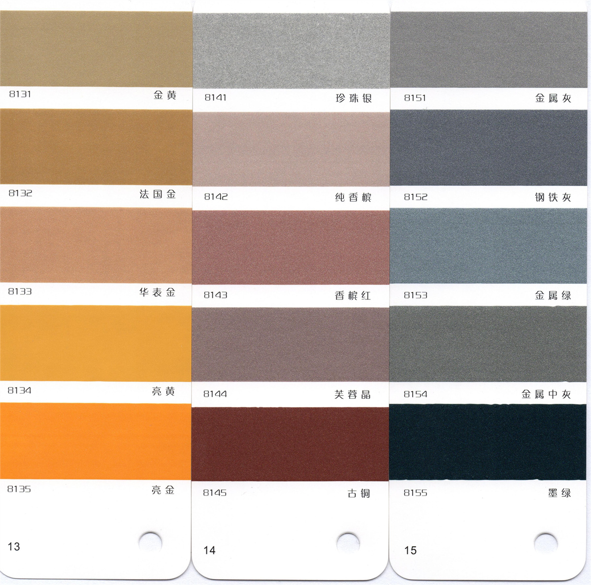 友情告知:以下氟碳漆顏色包含金屬質(zhì)感,由于圖片無法呈現(xiàn)實際效果,以及顯示器分辨率不同,此電子色卡只作為色系的參照物,具體顏色請咨詢?nèi)蛎赓M服務(wù)熱線:400-007-0957